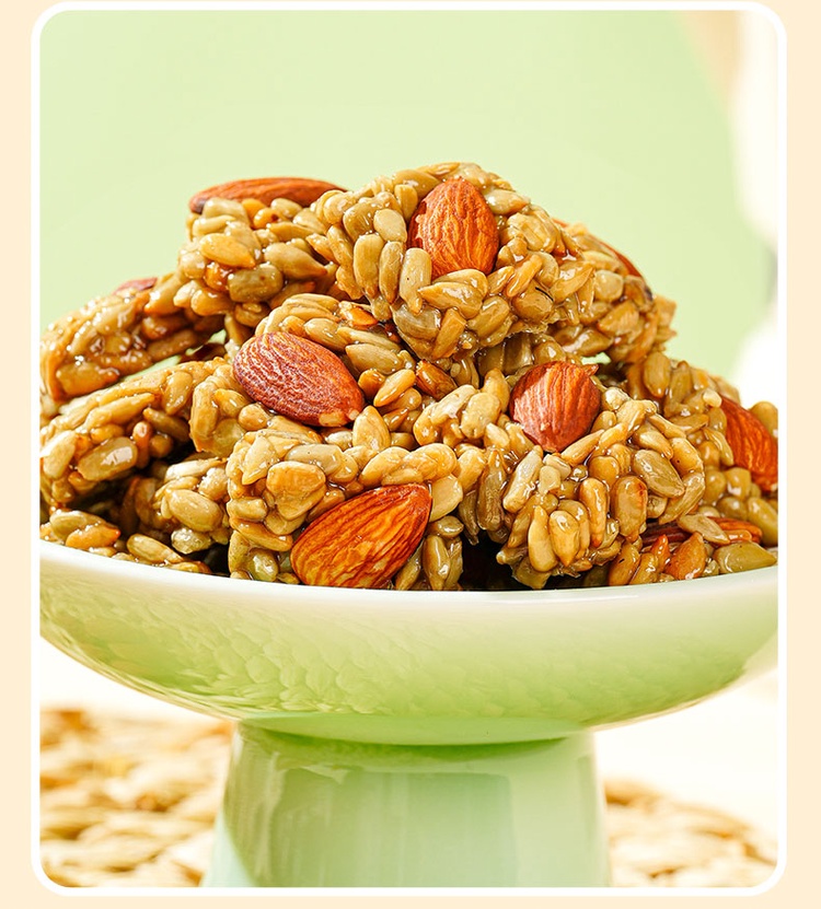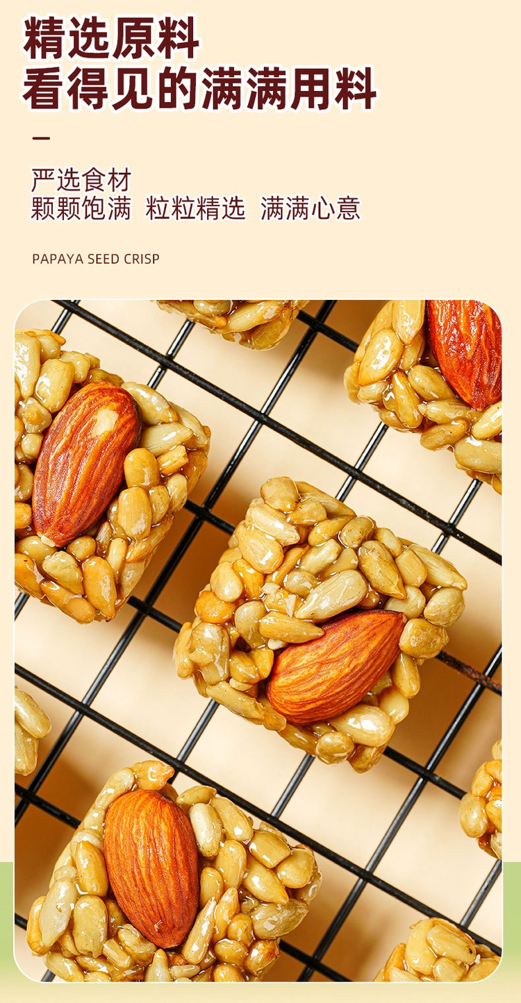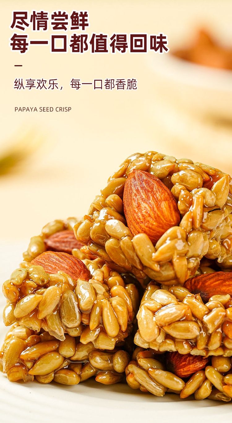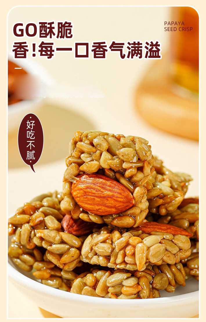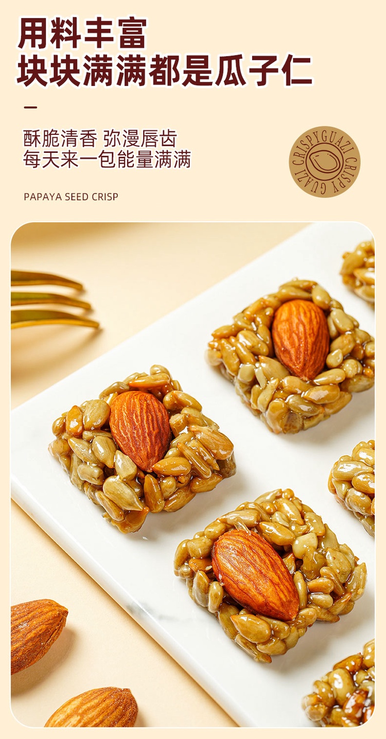 Padan Papaya Seed Nut Snacks 巴旦木瓜子酥 ·满满的坚果香,恰到好处的酥脆可口 ·无蔗糖、无色素、无防腐剂,食用安心 ·酥脆的瓜子仁夹着一颗饱满香脆的巴旦木 解馋又有饱腹感的小零食 巴旦木瓜子酥来啦 香酥瓜子仁夹着一颗 酥脆饱满的巴旦木 日常常备,美味齐分享