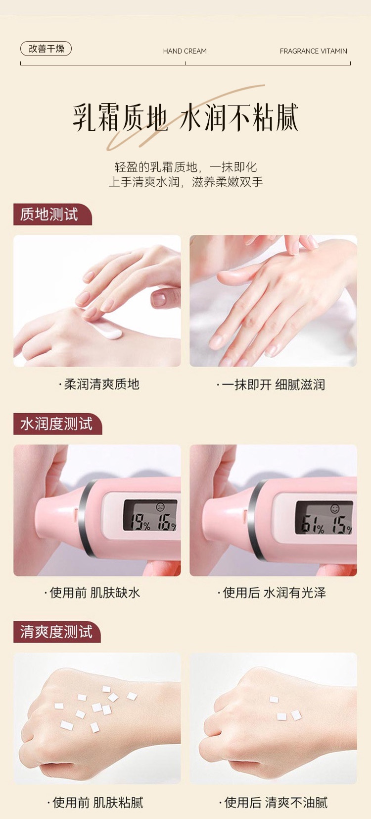 补水保湿,涂完后双手水润滑嫩