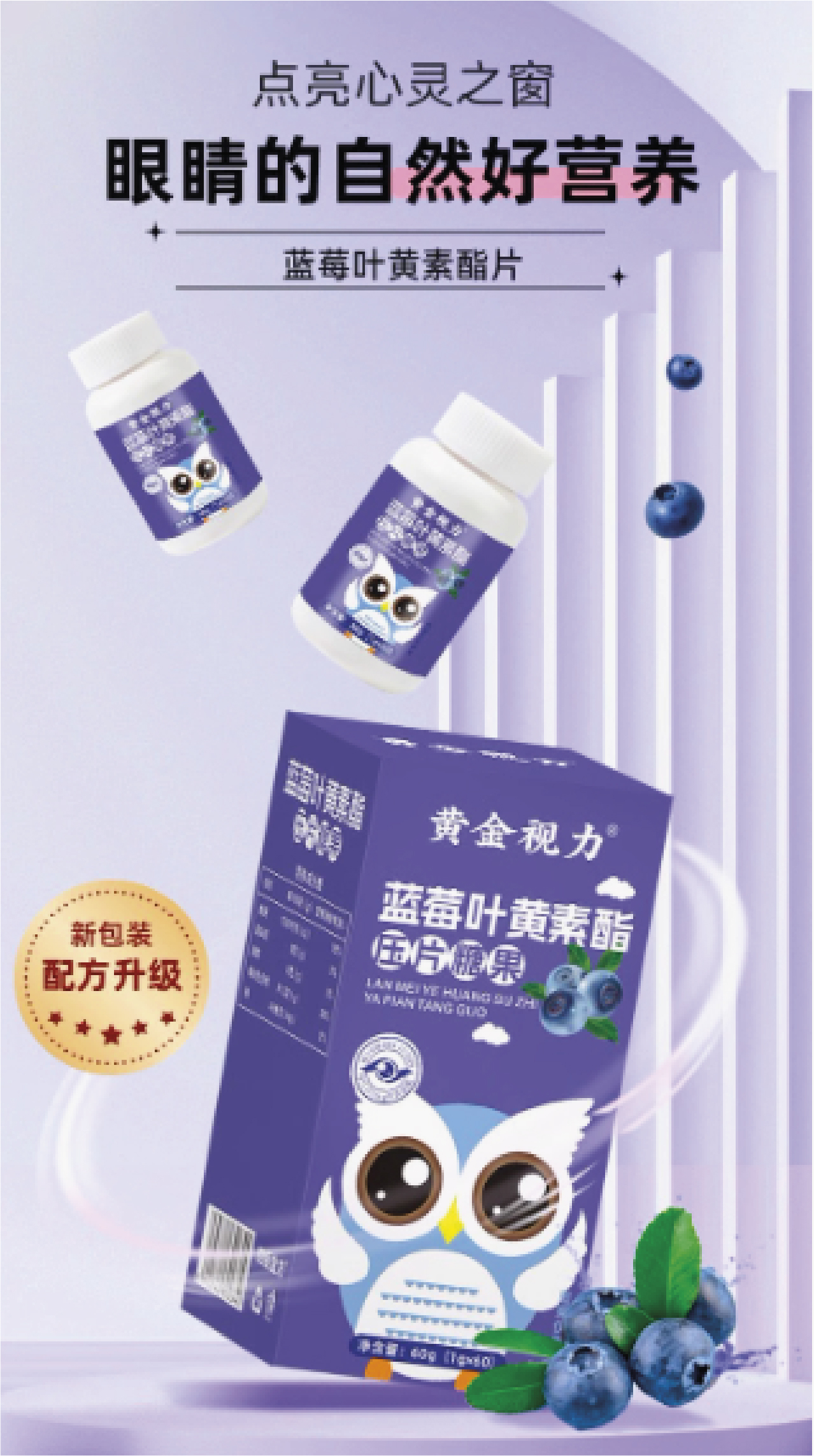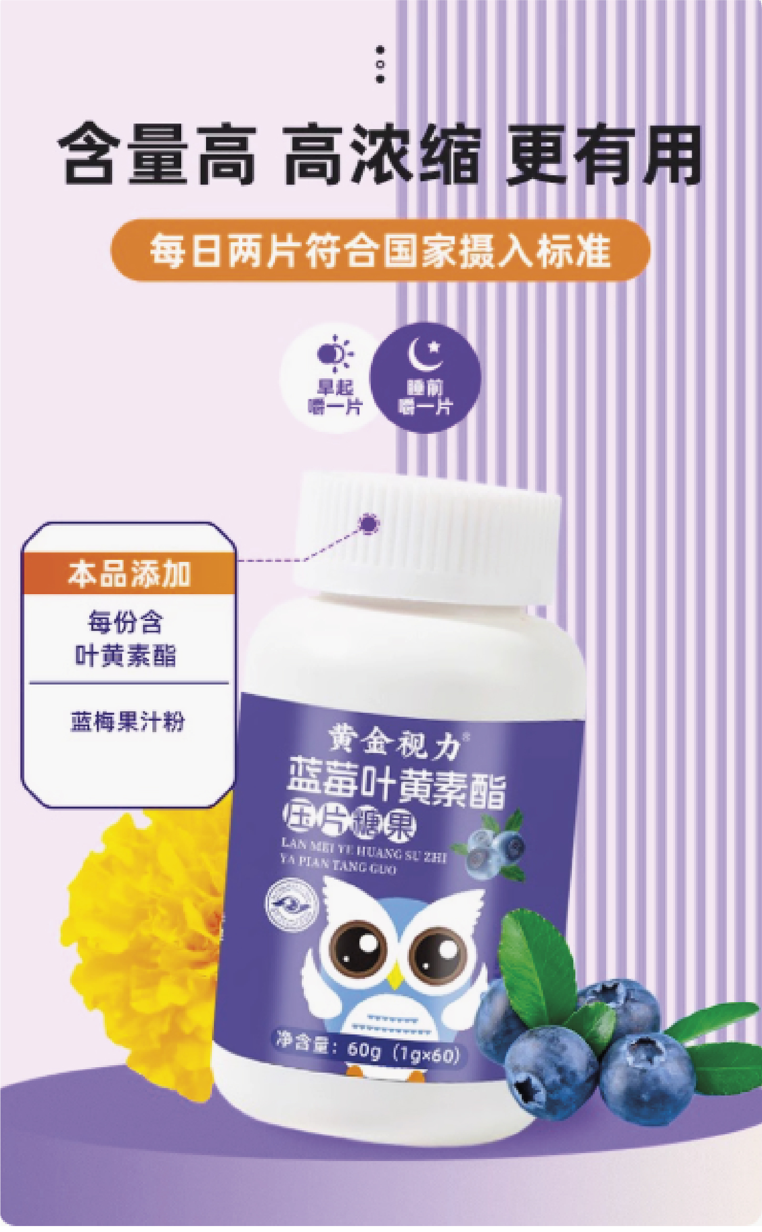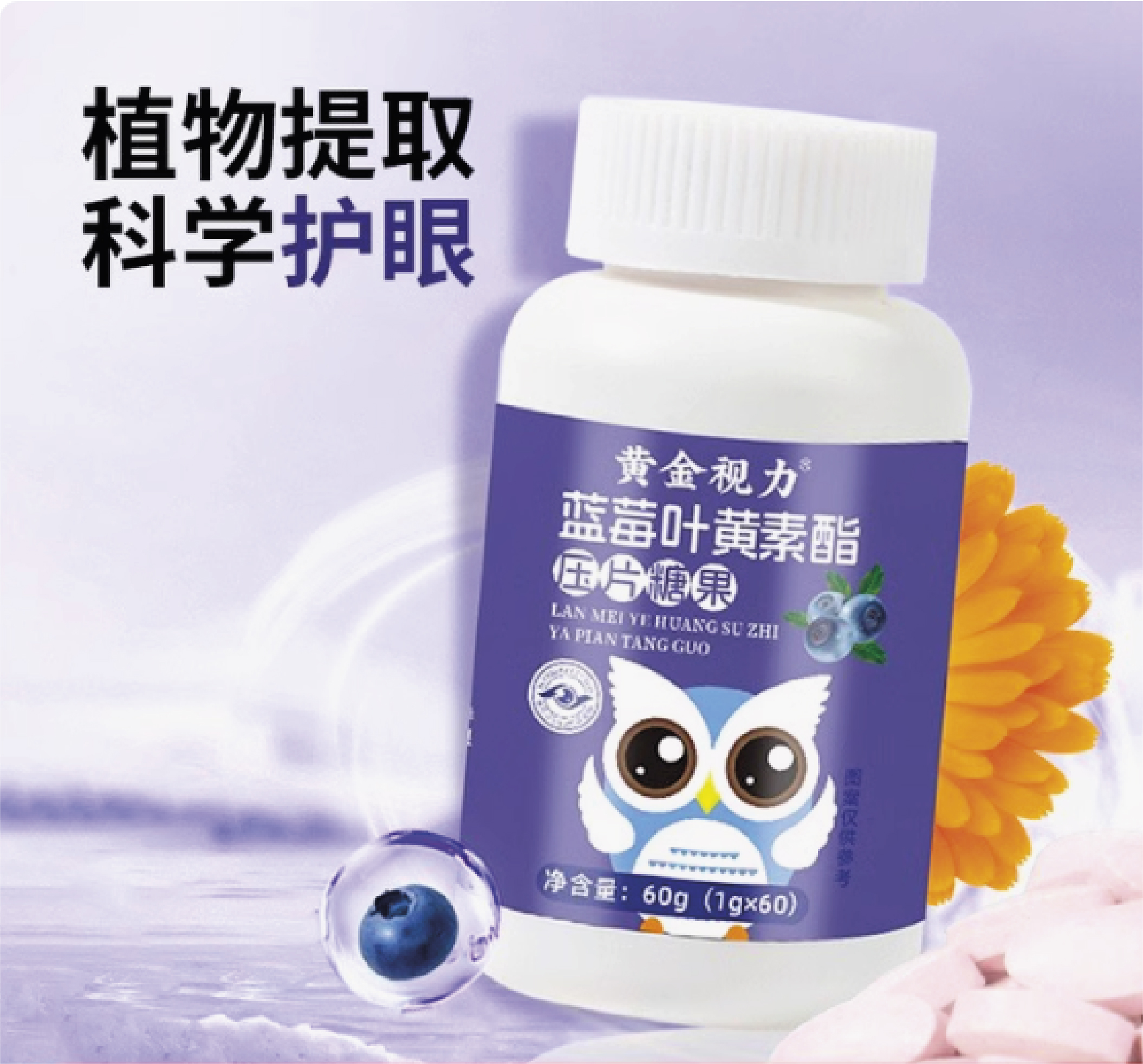 蓝莓视力压片糖果 眼睛疲劳干涩,想轻松护眼? 缓解不适,呵护眼睛: 缓解眼部疲劳,舒缓眼睛干涩 有效防蓝光,预防假性眼近视 呵护眼睛健康,提升明亮清晰度